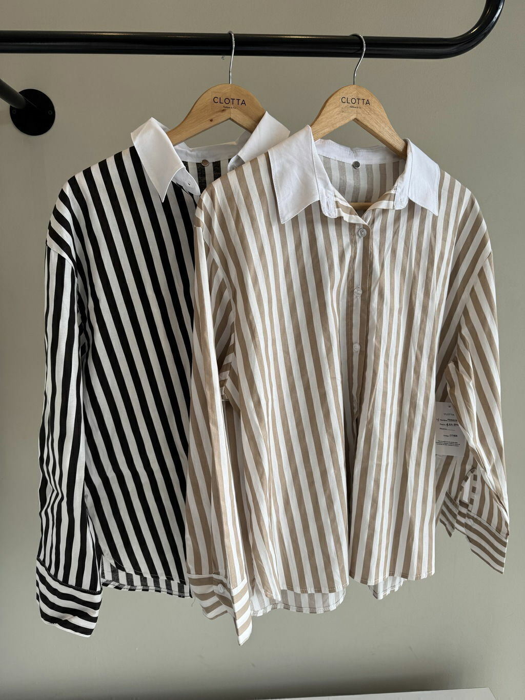 Camisa manga larga de batista con estampado a rayas verticales y cuello a contratono.