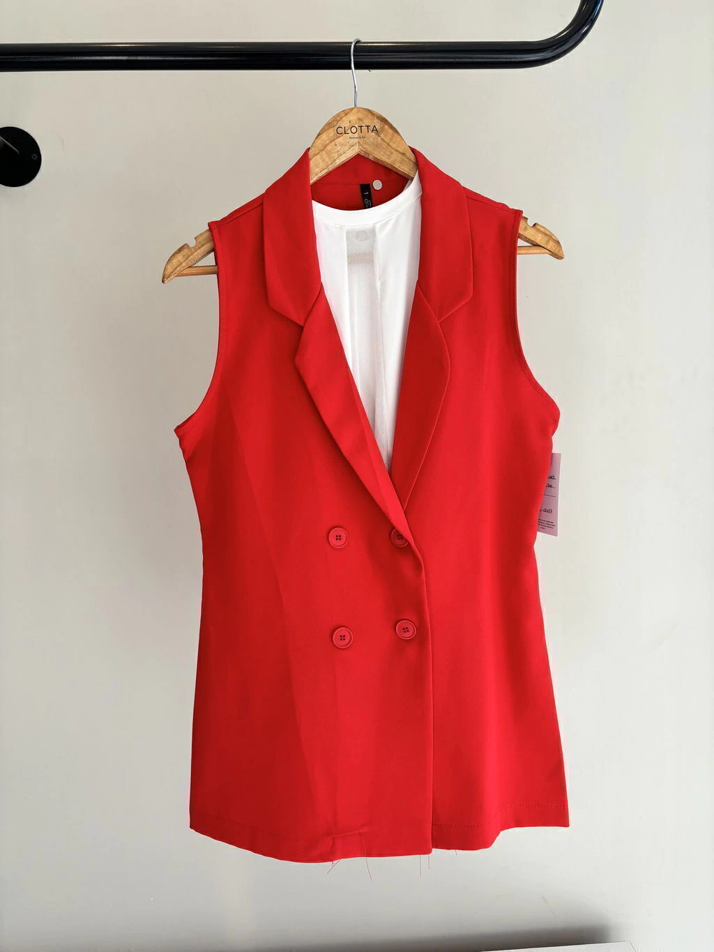 Chaleco sastrero con solapa cruzada y abotonado de tela crep, largo y sin forro.