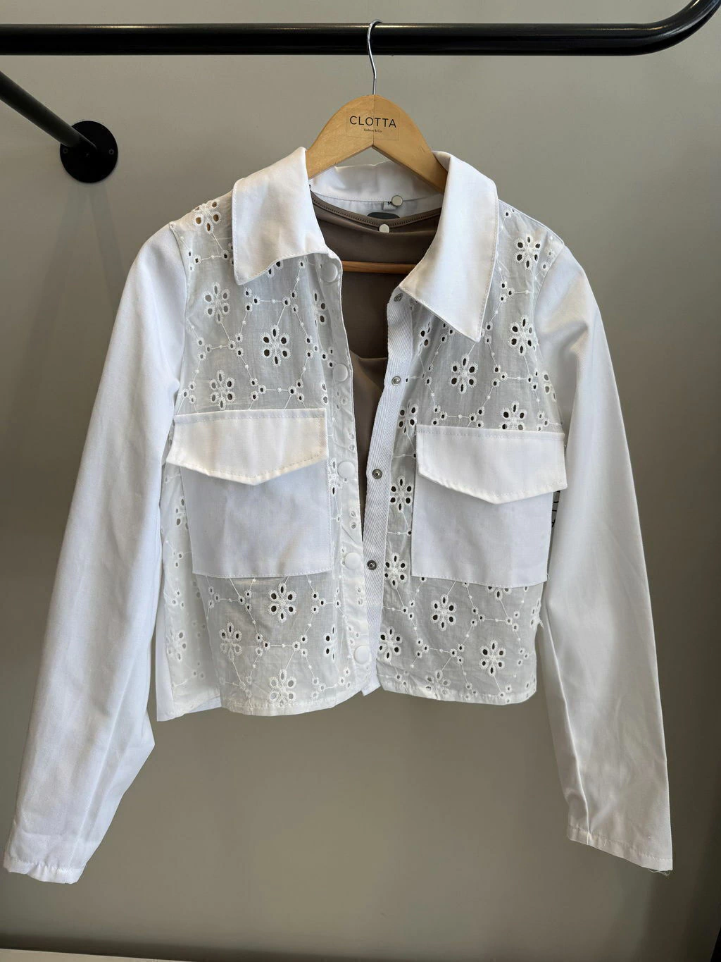 Chaqueta crop de gabardina y broderie con diseño floral calado. Tiene cuello camisero y dos bolsillos con tapa en la parte frontal.