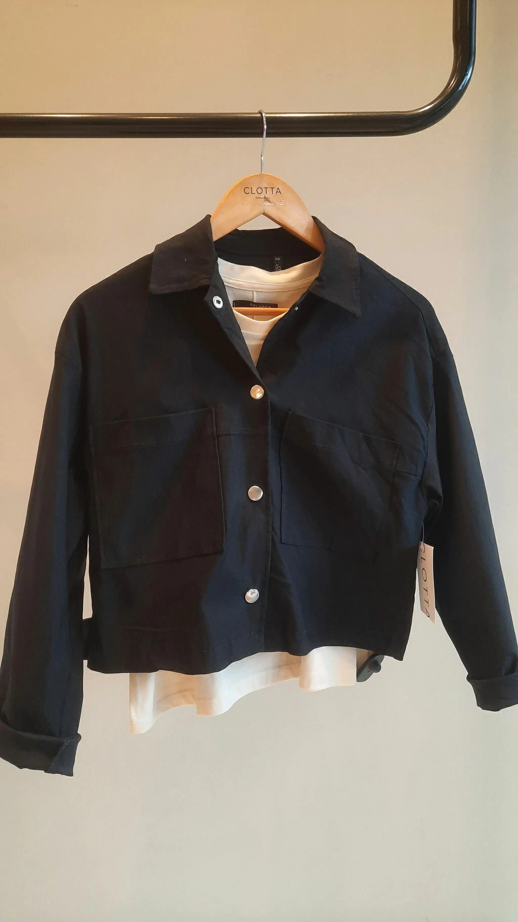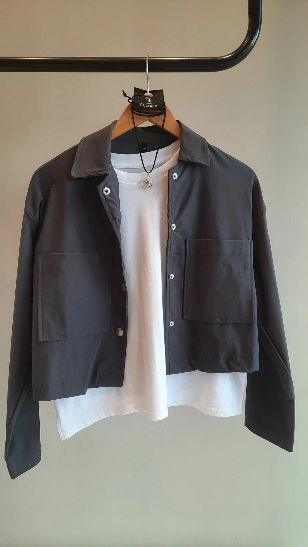 Chaqueta crop de bengalina con spandex, abotonada y bolsillos frontales.