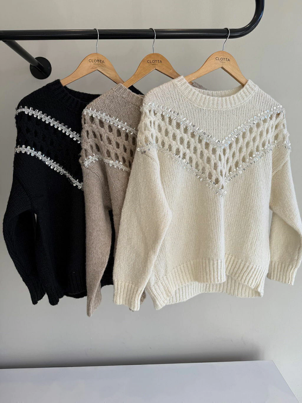 Sweater tejido cuello O con detalles de calado en delantero y apliques bordados.
